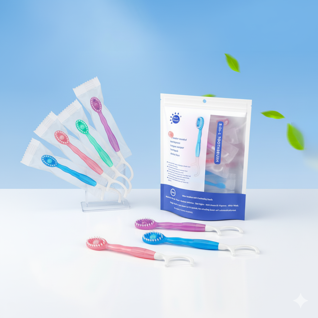 Answer 1: The five-in-one toothbrush features built-in blast beads that provide a refreshing sensation for your breath, while the soft bristle brush effectively removes plaque and food particles. The double bead floss helps clean between teeth, ensuring you have a thorough clean without the need for toothpaste or water.
